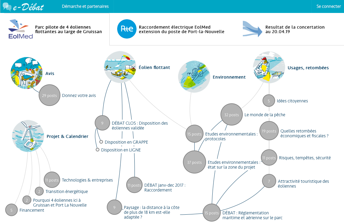 Une première utilisation de cette plateforme e-Debat a été expérimentée avec la société Quadran Energie Marine dans le cadre d'une concertation en lien avec le projet d’implantation d’un parc éolien expérimental au large de Gruissan.