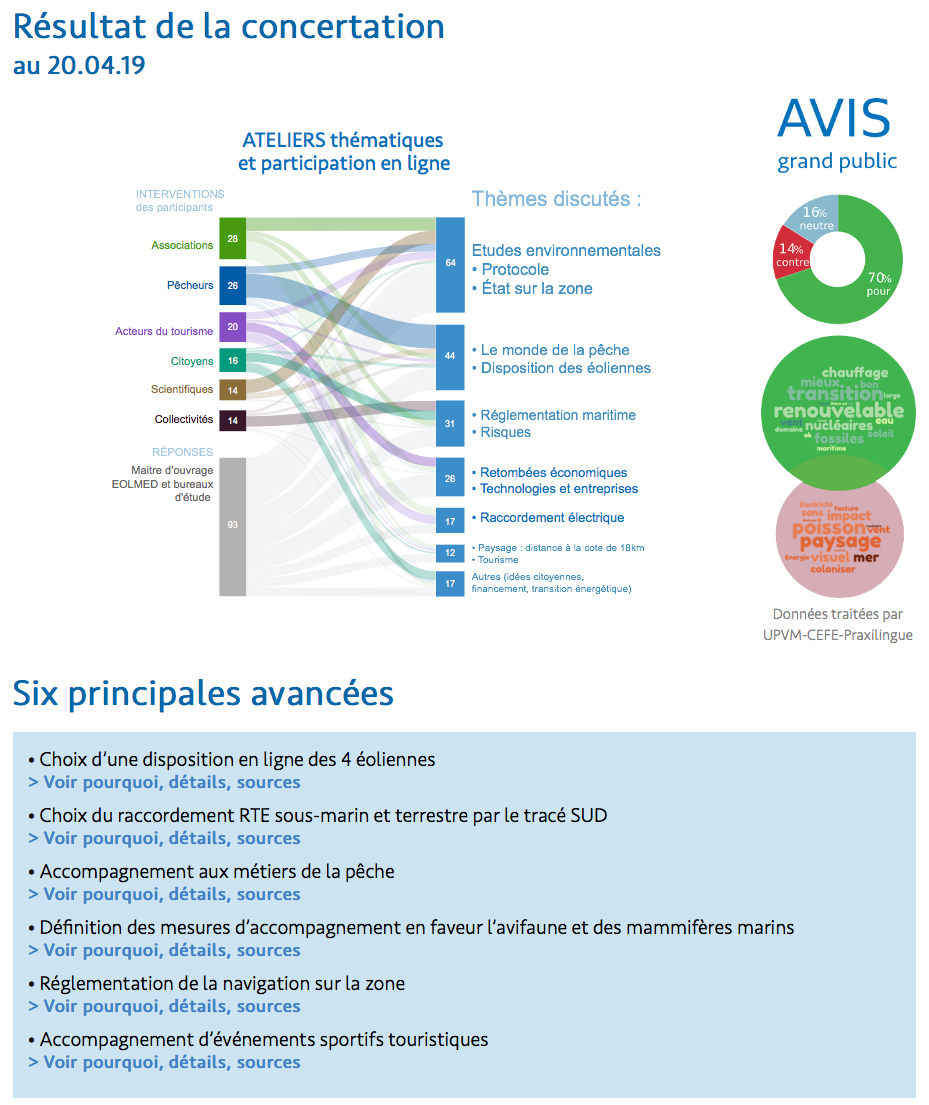Écran de la concertation préalable EolMed en ligne avec les sujets discutés présentés sous forme de graphe
