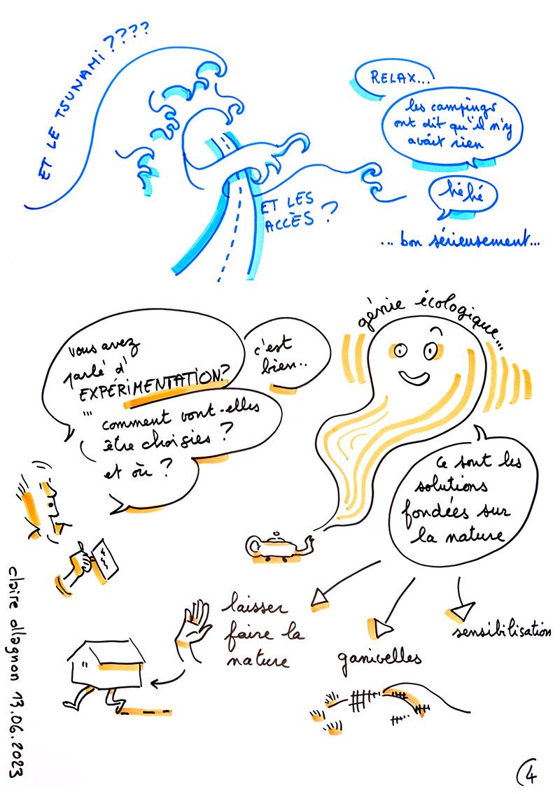 En petit comité, les participants n'ont formé qu'un seul groupe afin de choisir les solutions les plus adaptées en identifiant dans une liste, les actions pérennes, les actions préalables ou transitoires et les actions structurelles de réaménagement. Ensuite, chacun a pu définir les avantages, les inconvénients et les recommandations et/ou alternatives : sensibilisation à l'arrêt du nettoyage des plages en allant, soit dans les écoles ou en installant des panneaux ludiques.